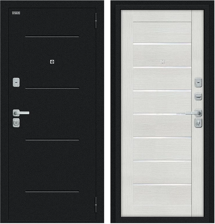 Надежная входная Дверь Браво Техно/BChrome Букле черное/Bianco Melinga премиум класса по цене 36 967 руб. Большая толщина стали защитит от проникновения в ваш дом, квартиру или коттедж. Используется очень качественная фурнитура: замки, цилиндры, ручки, защелки. Покрытие и отделка двери изготовлено под внимательным контролем производителя. Дверь имеет долгий срок службы и гарантию.
